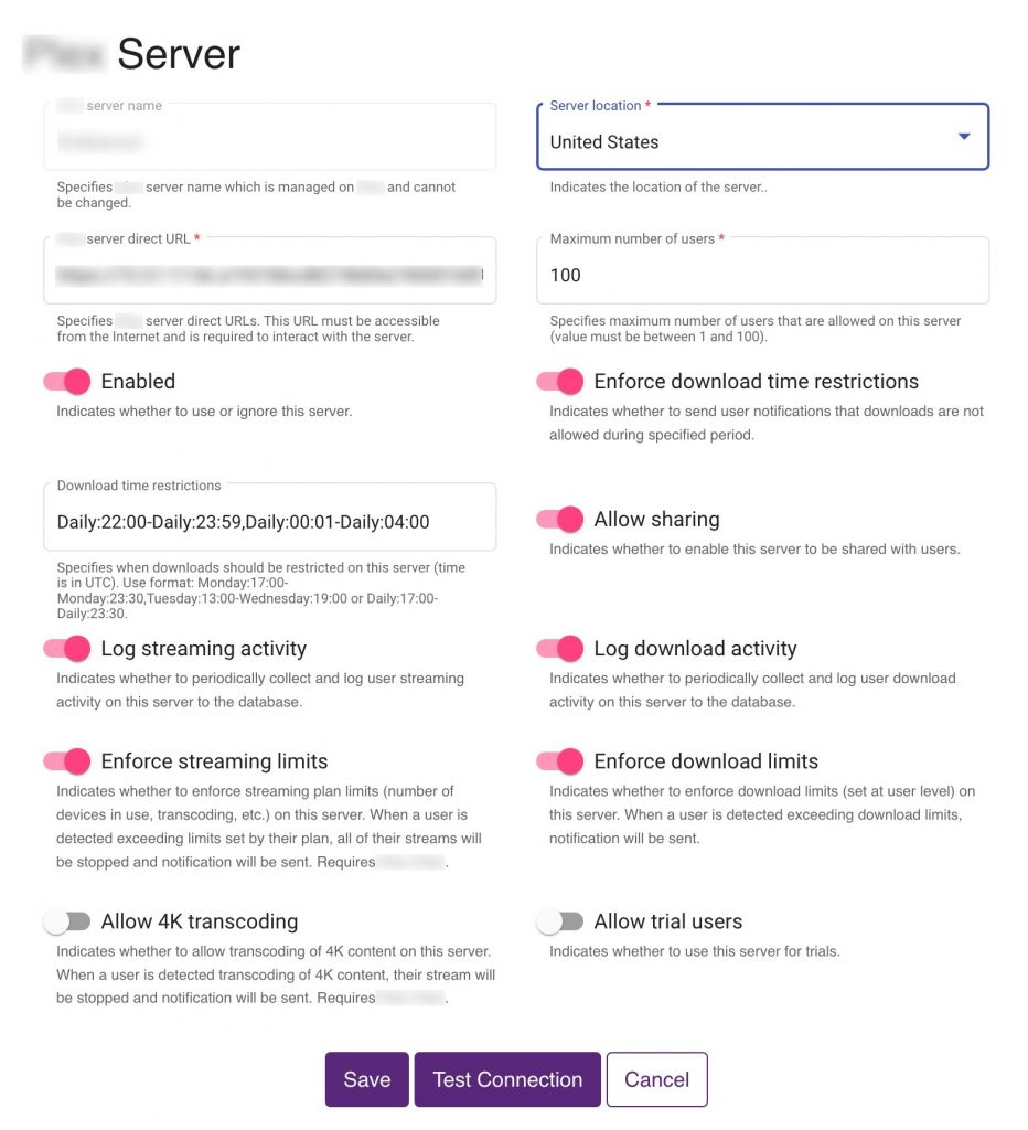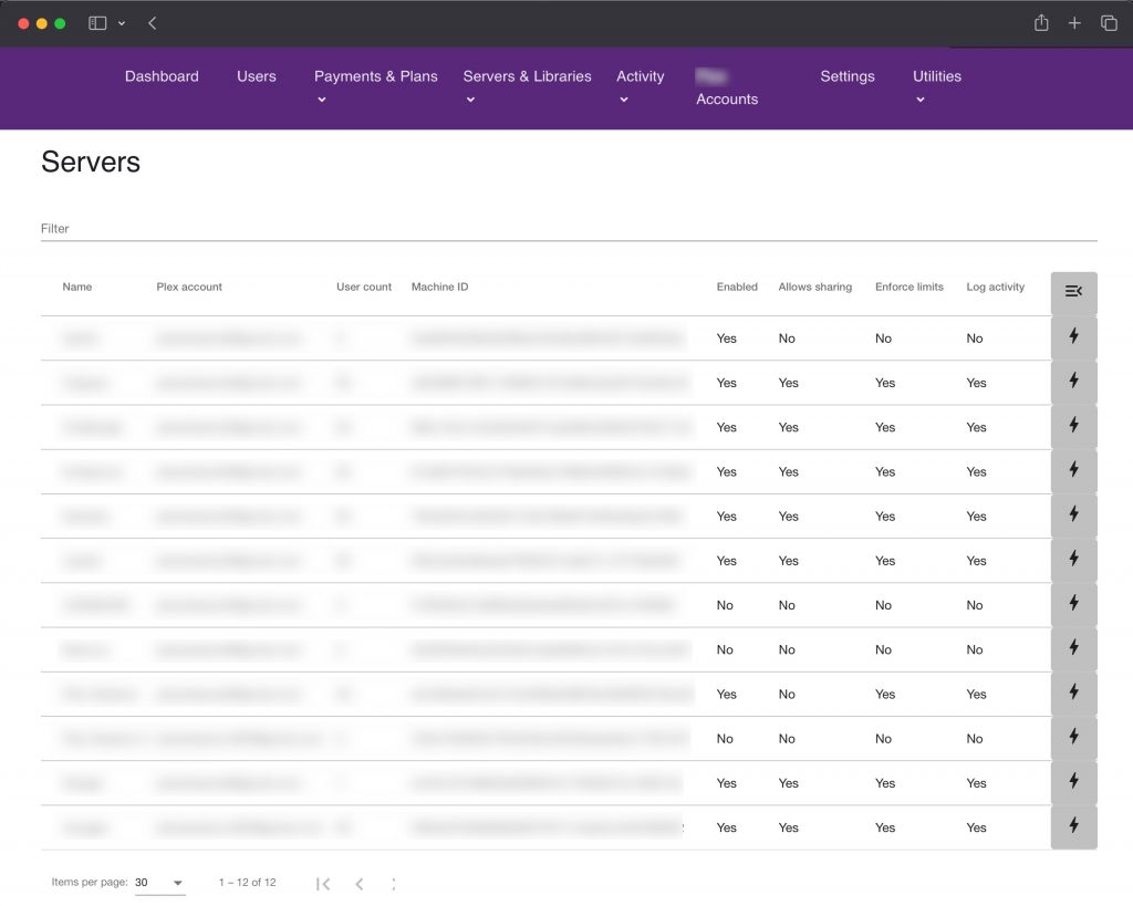 Fine grained control over each server allowing you to specify which servers are available for sharing, activity logging, streaming and download limits enforcement, trial users and more.