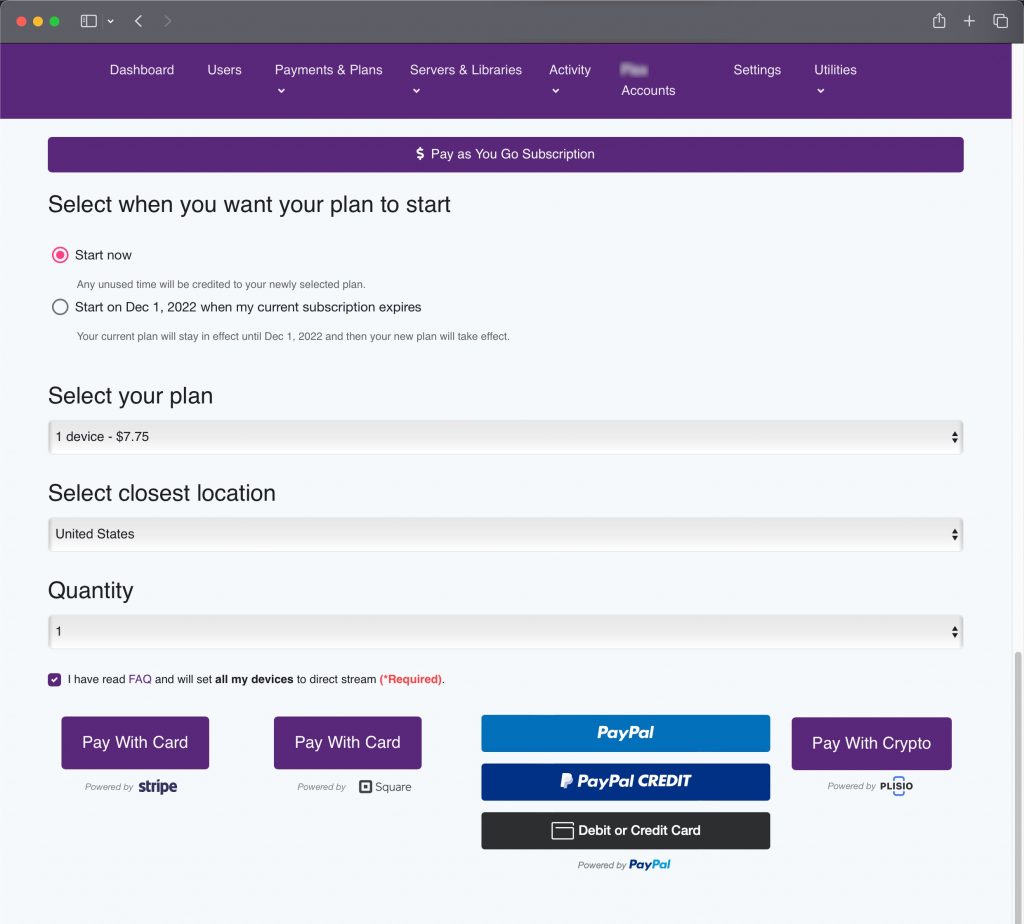 Accept payments through PayPal, Stripe or Crypto with automatic provisioning. Streams Manager will automatically select a server with sufficient capacity and available features and send your user a Plex share invitation through email. Streams Manager supports both pay as you go and recurring subscriptions.