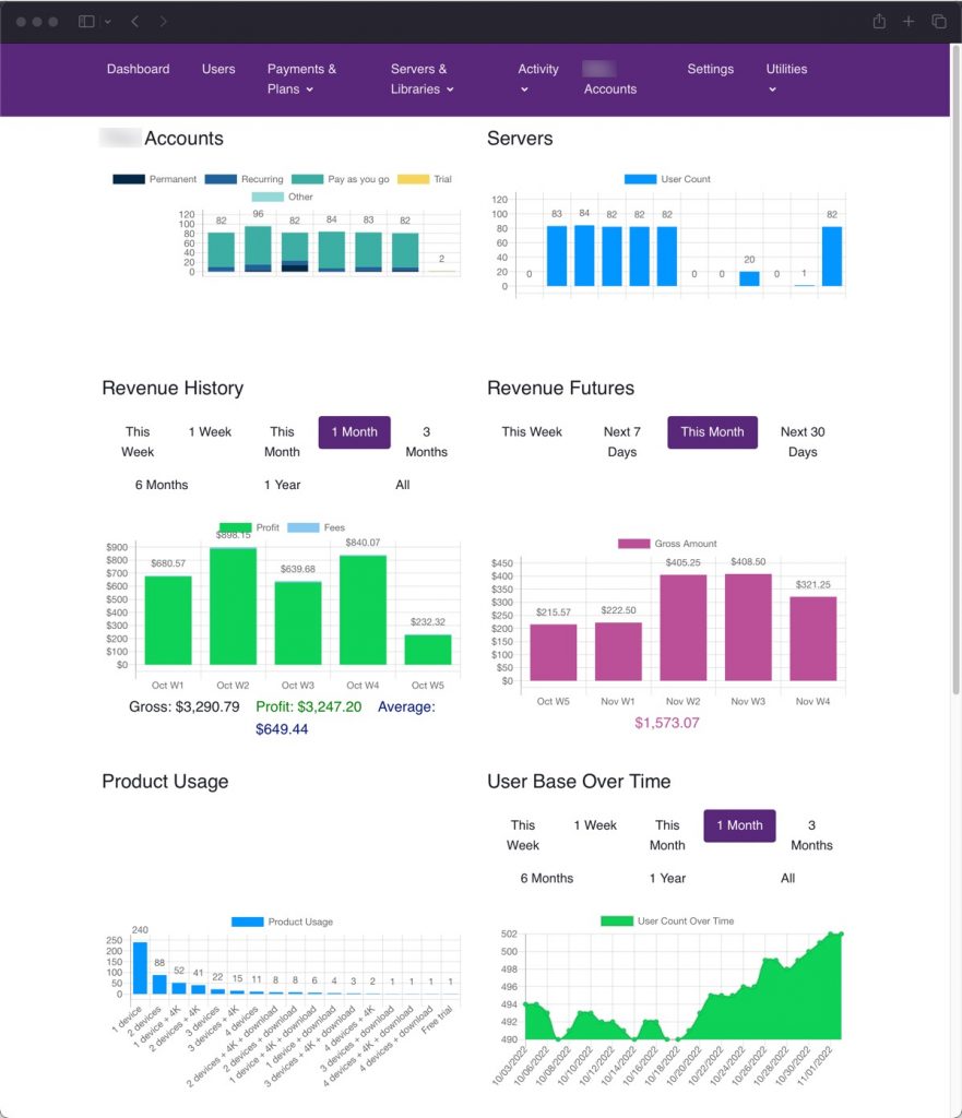 Full featured dashboard showing you at a glance view of your servers, users, revenues and more.
