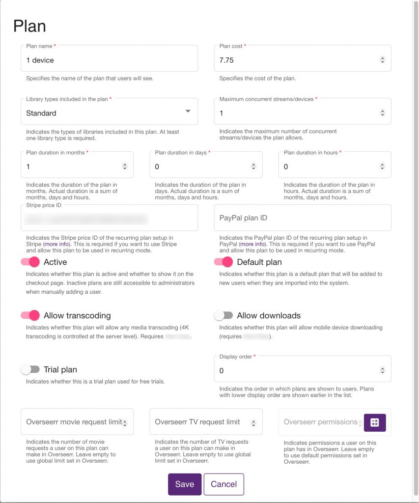 Streams Manager allows you to specify multiple plans you can offer to your customers with fine grained controls over plan cost, duration, number of simultaneous devices allowed, whether to allow transcoding, and more. Libraries can be packaged into groups and selectively included into plans allowing you to setup Basic, Standard and Premium plan hierarchy.