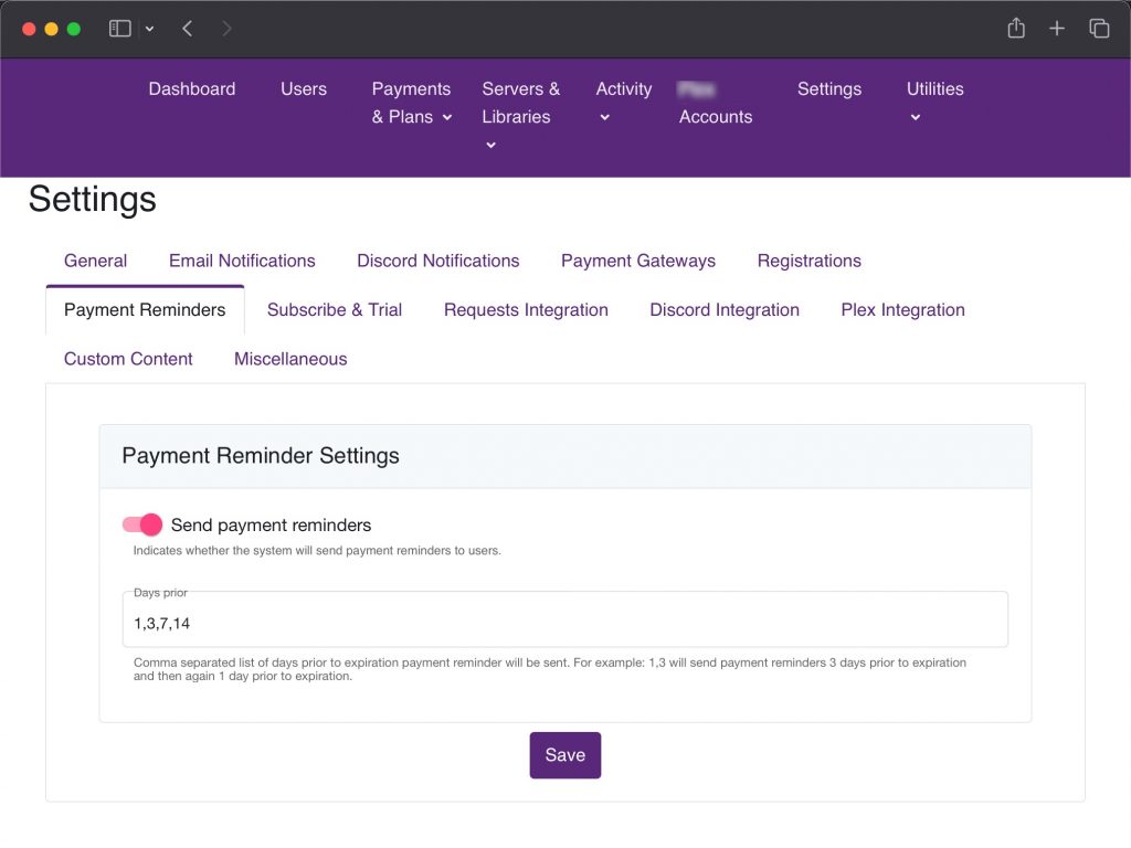 Fine grained control over each server allowing you to specify which servers are available for sharing, activity logging, streaming and download limits enforcement, trial users and more.